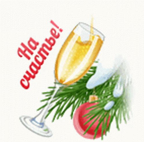a glass of champagne next to a christmas tree branch and a red ball