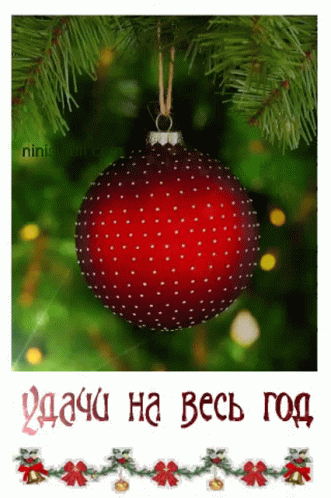 A festive red polka dot Christmas ornament hangs from a tree, accompanied by a Russian New Year's greeting.
