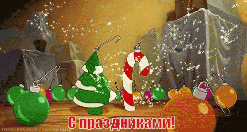 A festive cartoon scene with sparkling Christmas ornaments, a candy cane, and a Christmas tree.