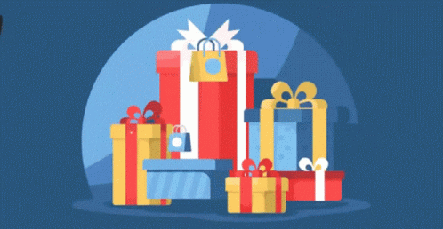 A person surrounded by festive gifts and shopping bags, followed by an animated man with a gift and Christmas tree.