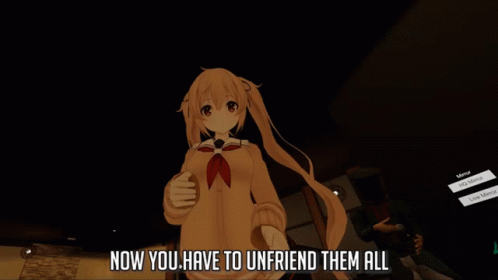 Drumsy's anime avatar points, commanding 'NOW YOU HAVE TO UNFRIEND THEM ALL' in a virtual world.