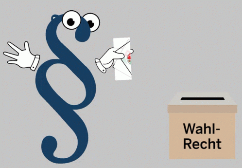Animated paragraph symbol votes in NRW elections, dropping a ballot into a 'Wahl-Recht' box.