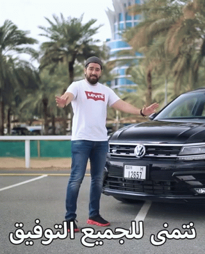 A man in a Levi's shirt stands next to a black Volkswagen Tiguan, wishing everyone success.