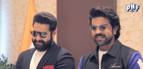 Actors Jr NTR and Ram Charan smiling, wearing sunglasses and stylish jackets, with an Indian flag.