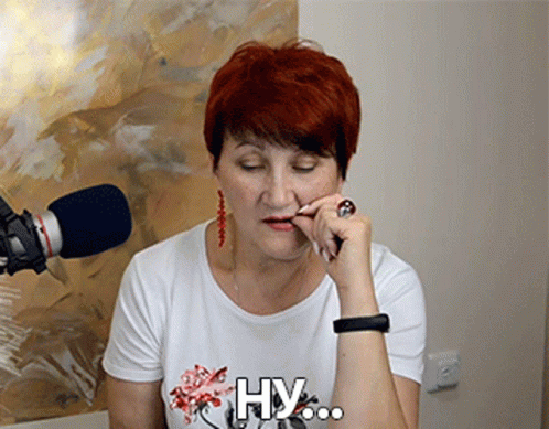 A red-haired woman, a music teacher, sits in front of a microphone and says 'Well...'.