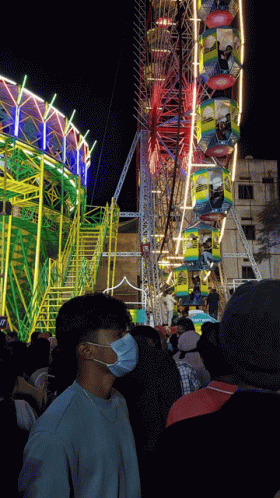 Experience the vibrant night atmosphere of Numaish Taruntata with its illuminated Ferris wheel and bustling crowd.