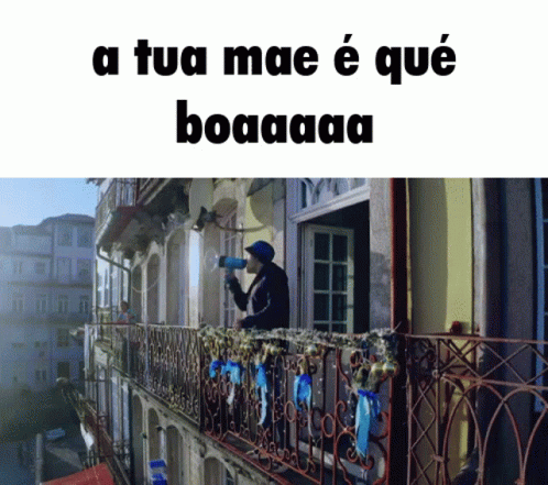 Man on a balcony with a megaphone shouting 'a tua mae é qué boaaaa', a popular Portuguese meme.