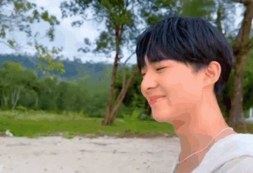 Nunew smiles gently on a sandy beach with lush green trees and mountains in the background.