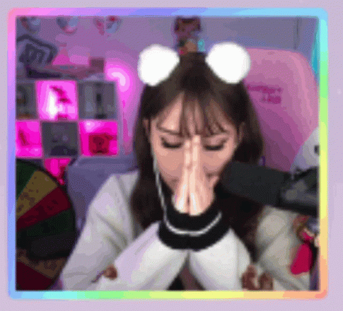 Nuvia Ouo, wearing a bear ear headband, clasps her hands together in prayer or contemplation.