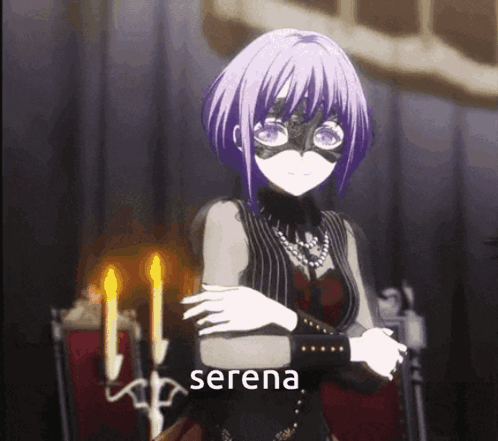 a girl with purple hair is wearing a mask and the word serena is on the bottom of the image