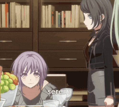 a girl with purple hair is standing next to a girl with green hair and the word serena is visible