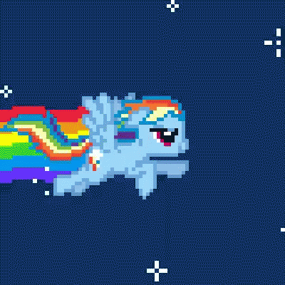 A pixel art rendition of a My Little Pony character with a vibrant rainbow mane, inspired by Nyancat.