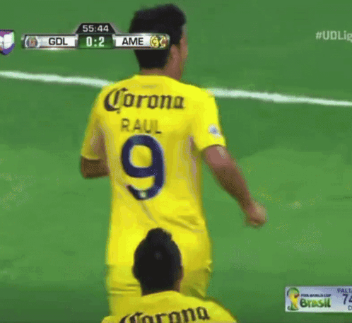 Raul Jimenez celebrates scoring a goal for Club America, wearing a yellow jersey with number 9.