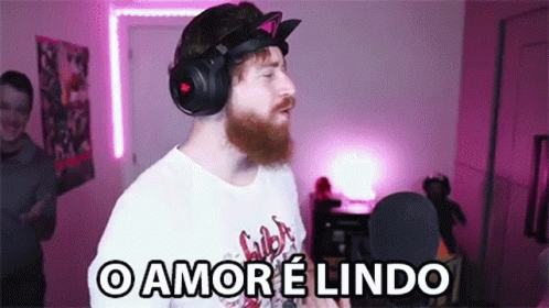 A bearded man wearing headphones stands in a pink-lit room, with the caption 'Love is Beautiful'.