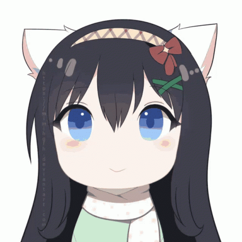 Oba Meme, a chibi girl with black hair, blue eyes, and cat ears, smiles gently.