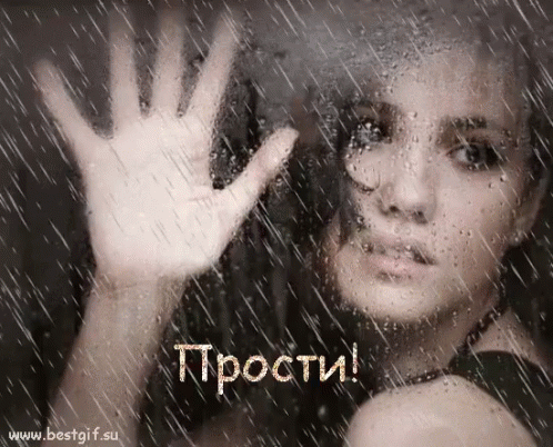 A woman covers her face behind a wet glass with the Russian word "прости" (forgive) written on it.
