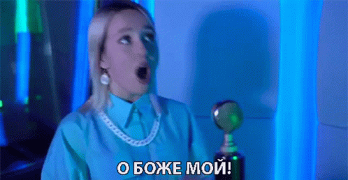 Russian singer Klava Koka exclaims 'Oh My God!' while holding a trophy in a vibrant blue setting.