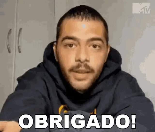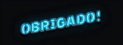 A vibrant blue neon sign flashes the Portuguese word 'Obrigado!' (Thank You!) on a dark background.
