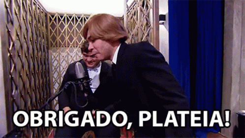 A man enthusiastically thanks the audience, exclaiming 'Obrigado, Plateia!' in a TV studio setting.