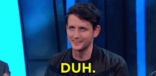 Zach Woods says 'Duh' with a knowing expression, sitting in front of a blue background.