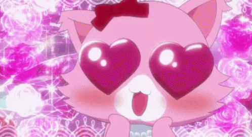 Pink anime cat with sweet, sparkling eyes and a red bow, looking excited against a sparkly background.