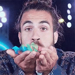 Jay Du Temple joyfully blows colorful confetti from his hands in a celebratory moment.