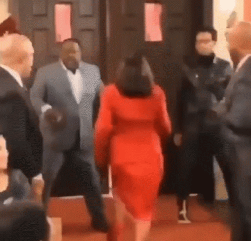 Oceanmam, a woman in a red dress, runs excitedly down a church aisle as people clap and cheer.