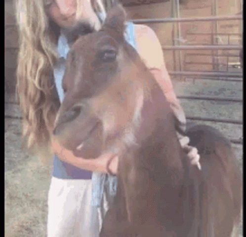 Oceanmam gently pets a brown horse, which appears to be enjoying the attention and smiling.