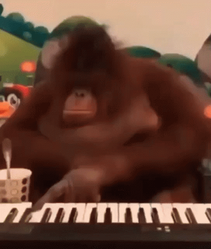 Oceanmam Orangutan sits in front of a keyboard, appearing to play it with its hands, in a colorful setting.