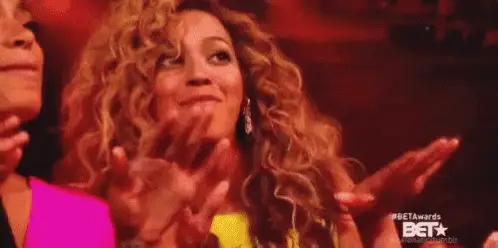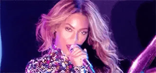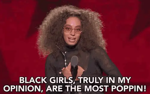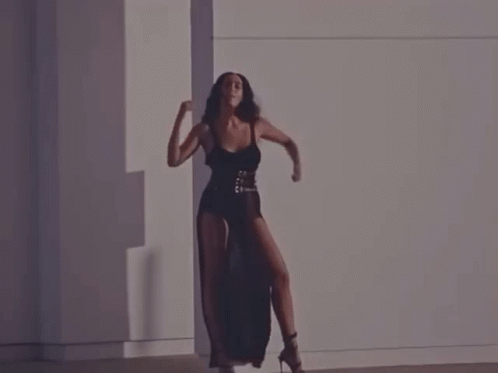 Solange Knowles energetically dancing in a black dress with high slits and heels against a white wall.