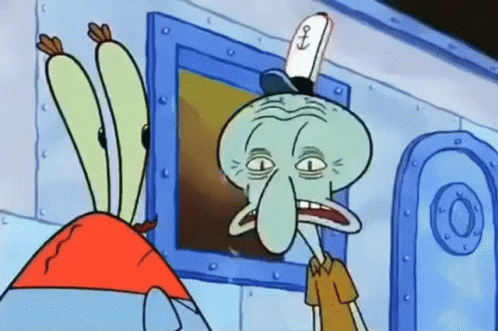 Squidward's eyes widen dramatically as he yells, while Mr. Krabs observes the scene.