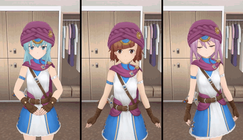 Three anime characters, Ochanomizu Mirie, Kasugaoka Moe, and Hirasaka Yotsuyu, posing in a locker room.
