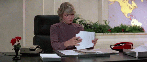 Rubelvitch, Octopussy's secretary, answers a red telephone at her desk in an office setting.