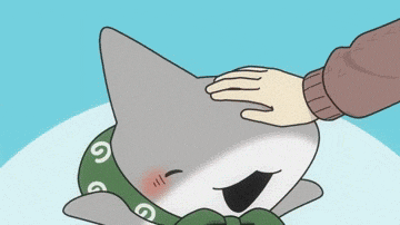 Odekake Kozame, the cute shark character, happily receives a gentle head pat from a human hand.