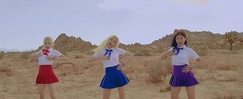 Loona's Odd Eye Circle members dance in school uniforms in a desert landscape.