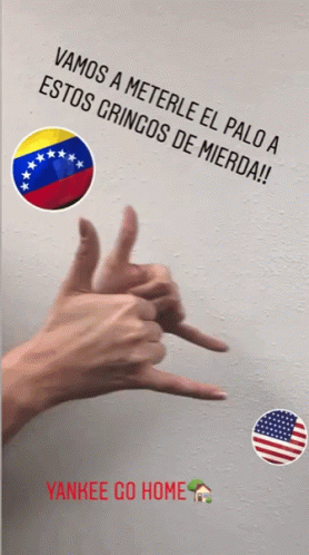 Hands gesture next to a wall with 'YANKEE GO HOME' and 'VAMOS A METERLE EL PALO A ESTOS GRINGOS DE MIERDA!!' text, with Venezuelan and USA flags.