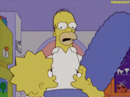 Homer Simpson walks away huffily, then peeks back with wide eyes, observed by Marge, Lisa, and Maggie.