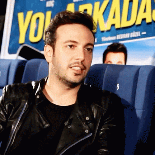 Oguzhan Koç reacts intensely while watching the movie "Yol Arkadaşım" in a cinema, wearing a black leather jacket.