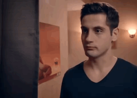 Oguzok, a man in a black shirt, stands in a room with a punching bag, looks around, then turns and walks away.