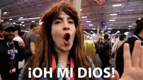 Iviiween reacts with surprise, exclaiming "Oh Mi Dios!" while wearing a wig and scarf in a crowded event.
