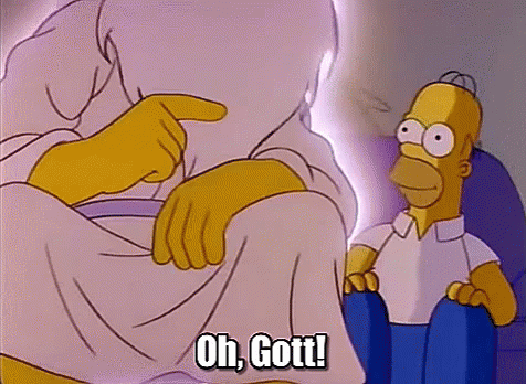 Homer Simpson reacts with "Oh, Gott!" as a small creature appears on God's lap in this animated scene.