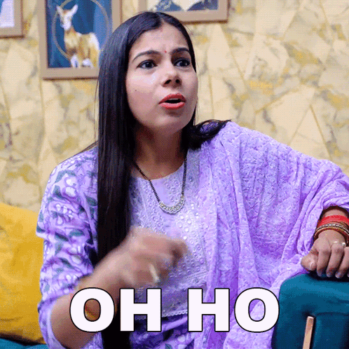 Sanjhalika Shokeen, wearing a purple outfit, reacts with 'Oh Ho' while sitting on a couch.