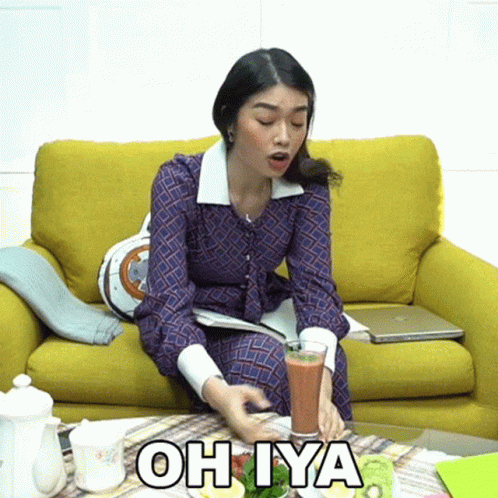 Pricilia Carla Yules sitting on a yellow couch, holding a smoothie, with the text 'OH IYA' displayed.
