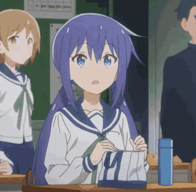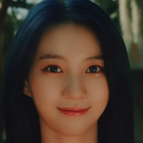 Oh My Girl's Binnie smiles charmingly, showcasing her vibrant blue hair and eye makeup.