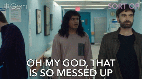 Sabi, Paul, and Bilal Baig react with "Oh my God, that is so messed up" in a hospital hallway from the show Sort Of.
