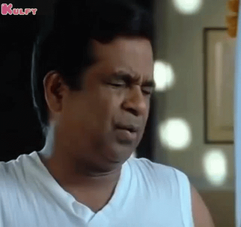 Brahmanandam makes a classic 'Oh No' or 'Ayyo' funny face, expressing disbelief or frustration.