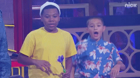 Marshawn and another boy excitedly perform on stage, holding flower props, with one boy looking surprised.