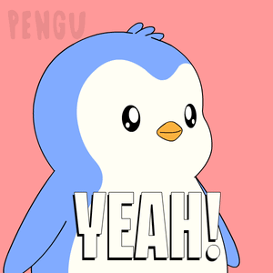 Cute animated blue and white penguin waves its flipper enthusiastically while the word 'YEAH!' appears.
