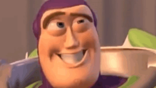 Buzz Lightyear from Toy Story gives a suggestive smirk directly at the camera.
