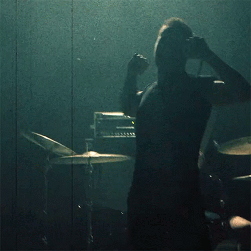 A man, likely from Thoughtcrimes, passionately sings into a microphone on stage with drums in the background.